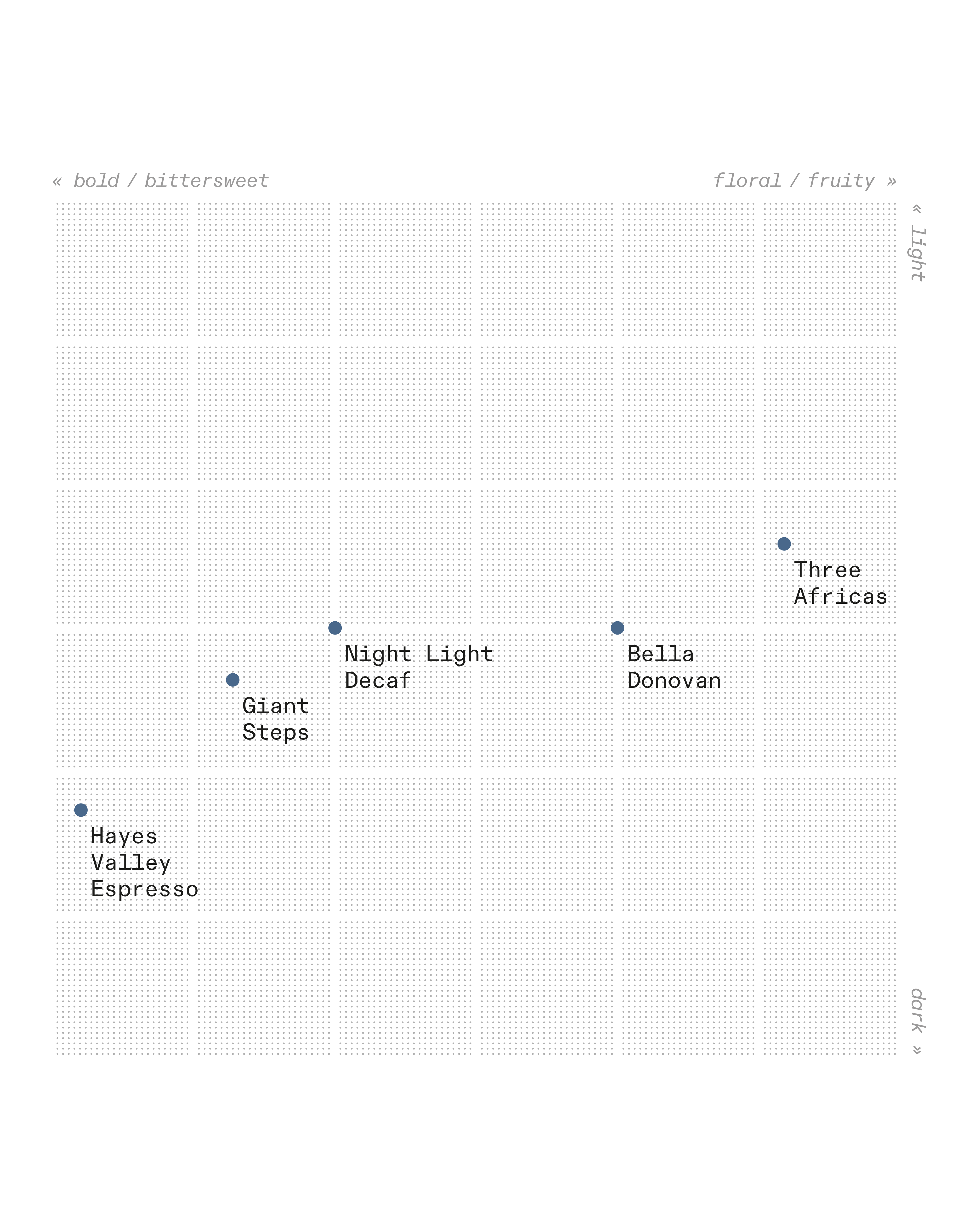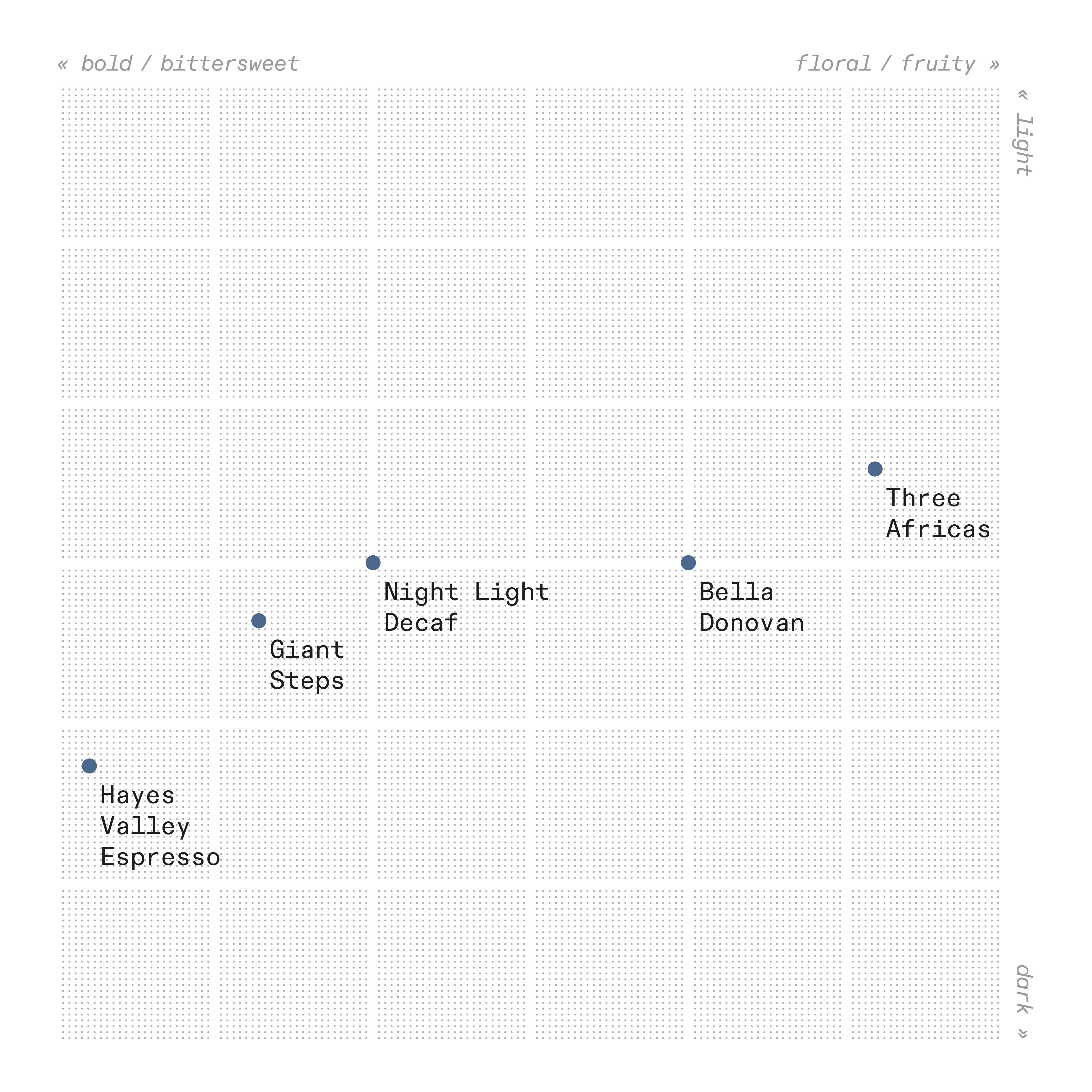 이 블렌드는 에티오피아 내추럴 커피를 사용하여 과일 향을 강조합니다. 단맛과 바디감을 끌어올리기 위해 비교적 다크 로스트에 가깝게 로스팅된 벨라 도노반은 커피메이커와 같은 비교적 정교하지 않은 추출에도 향미를 잘 표현하며, 우유나 크림과 곁들여 마시면 더욱 풍성한 맛을 선사합니다.